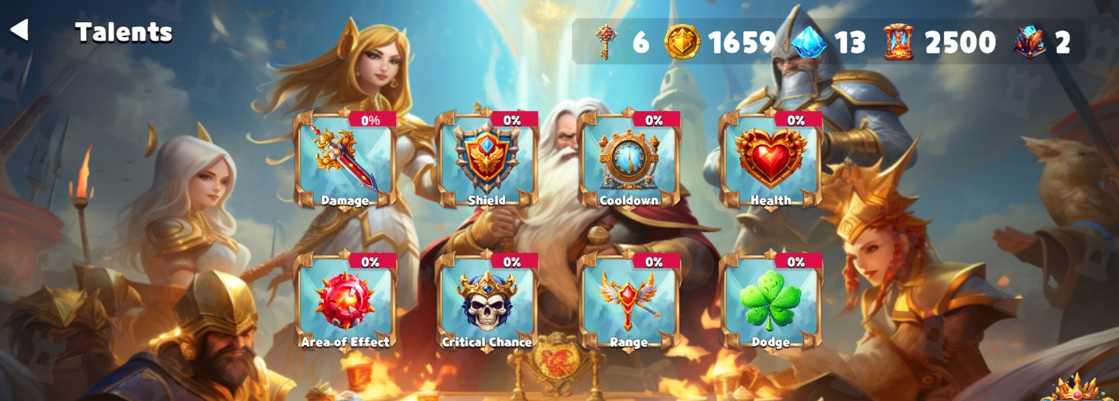 With a variety of talents to choose from, such as Damage, Shield, Cooldown, Health, Area of Effect, Critical Chance, Range, and Dodge, you have the freedom to enhance different aspects of your character's capabilities. Whether you seek to increase your offensive might, bolster your defenses, or fine-tune your agility, talents are the pathway to achieving your desired combat proficiency.